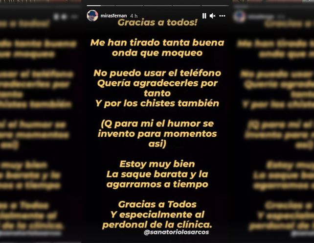 Desde el Sanatorio de los Arcos de la ciudad de Buenos Aires, Mirás hizo una publicación en sus historias de Instagram.