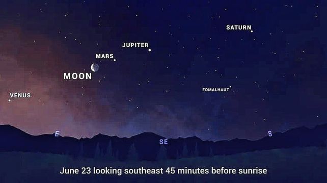 Además, el 24 de junio la Luna creciente brindará otro espectáculo al colarse en la alineación previa al amanecer, apareciendo entre Venus y Marte.
