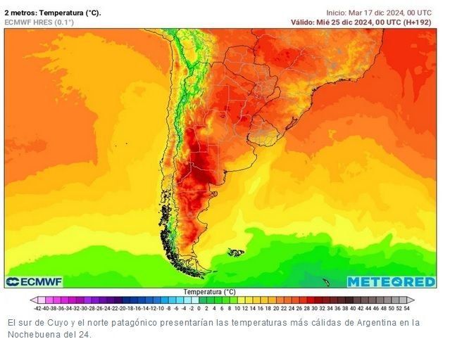 Tras el paso del frente frío, hay una alta probabilidad de que la mesa pueda armarse afuera para la Nochebuena en Córdoba, Santa Fe, Entre Ríos, Buenos Aires, Capital Federal y La Pampa, con temperaturas aproximadas entre 15 y 25 °C dependiendo el sector. Más cálido podría presentarse hacia la zona del sur de Mendoza, Neuquén y norte de Río Negro, donde en la víspera de la Navidad podría haber marcas de 25 a 30 °C.