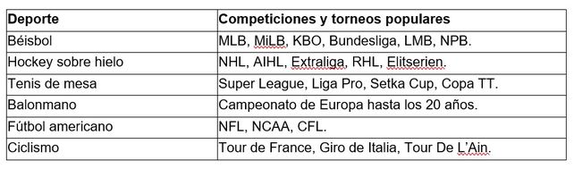 Las plataformas de apuestas reguladas ofrecen miles de eventos deportivos todos los días para hacer apuestas anticipadas y en vivo, por lo que siempre tendrás oportunidades para darle valor a tus predicciones. Por supuesto, la oferta es mucho más extensa, por lo que finalizamos con una lista de otros nichos deportivos populares en los sitios de apuestas: