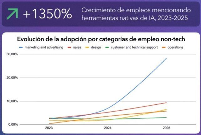 Otra de las conclusiones es que el manejo de herramientas de IA ya no es opcional, puesto que se exige incluso en roles no técnicos. Departamentos de Ventas, Marketing o Soporte ahora deben saber prototipar, automatizar e integrar LLMs, generadores de imágenes y herramientas para tomar notas, razón por la cual las menciones de IA en estas categorías crecieron más de un 50% en el último año.