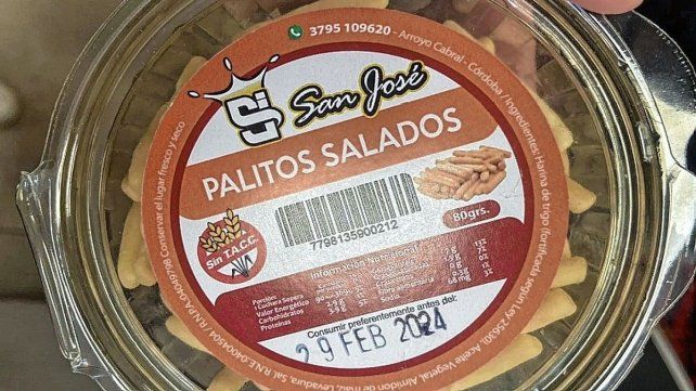 "Prohíbese la elaboración, fraccionamiento y comercialización en todo el territorio nacional, y en las plataformas de venta en línea de los productos: Palitos Salados, marca San José, RNE: 04004504 - RNPA: 04049798, Arroyo Cabral, Córdoba, con el símbolo Sin TACC, y Maní crocante sabor Salame, marca San José, RNE: 04004208, RNPA: 04077982, Arroyo Cabral, Córdoba, con el símbolo Sin TACC”.