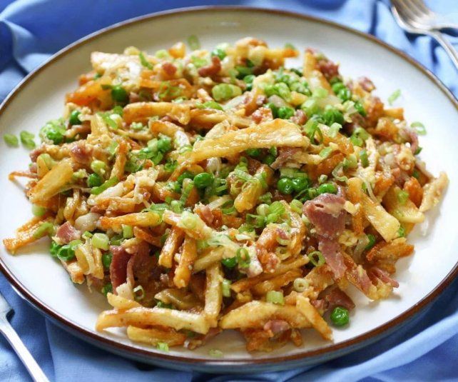 Agregar las papas fritas al revuelto de huevos y mezclar bien. Servir caliente y disfrutar.