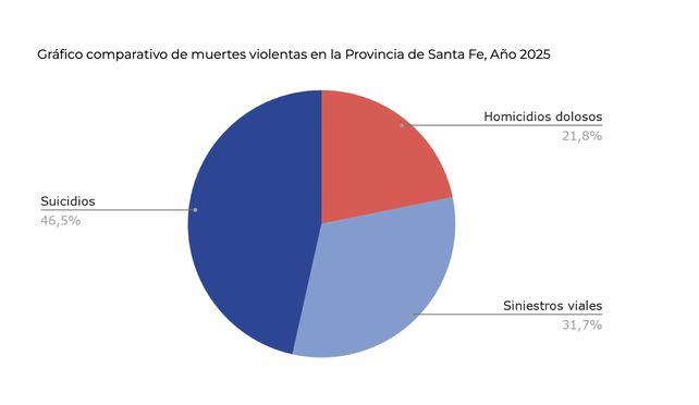 Según la reconstrucción estadística realizada por el organismo, se registraron aproximadamente 448 suicidios en la provincia, lo que representa el 46,5% del total de muertes violentas (964 casos). En comparación, los homicidios dolosos fueron 210 (21,8%) y las muertes en siniestros viales 306 (31,7%).