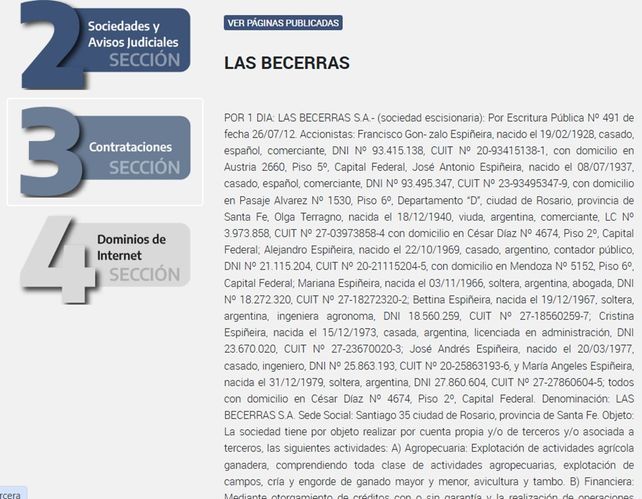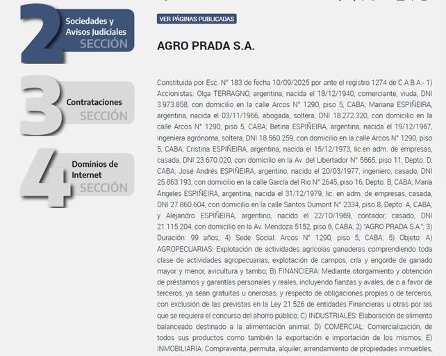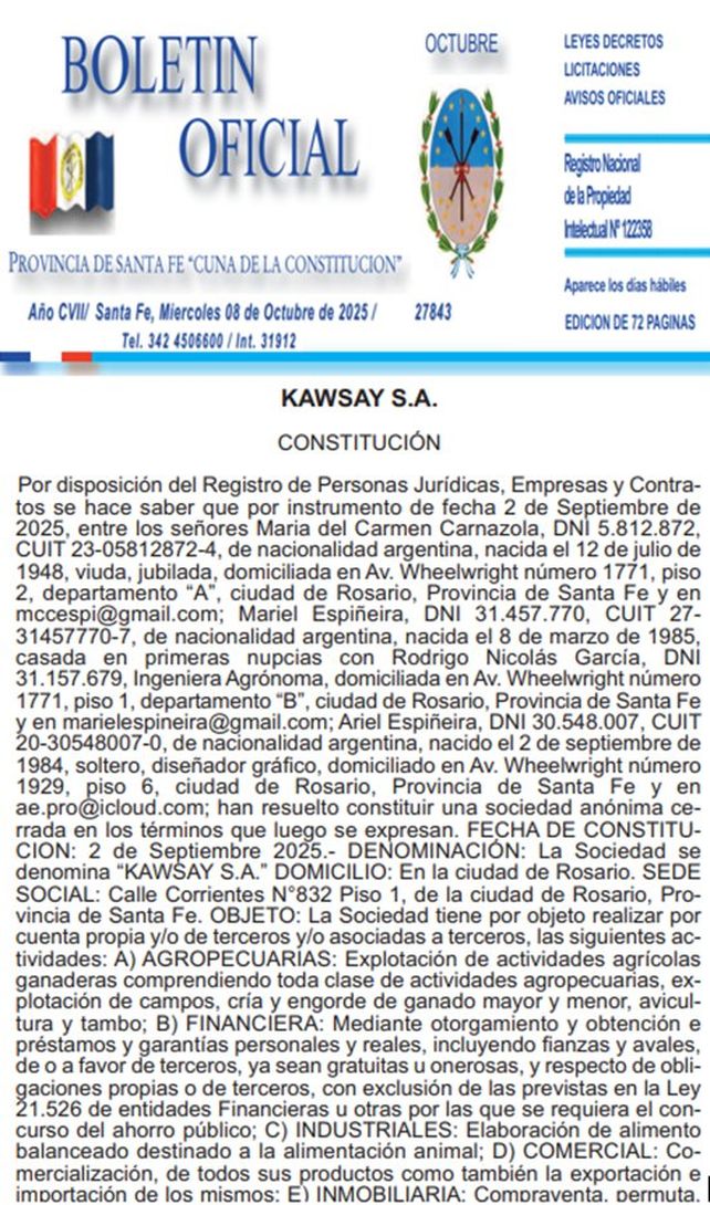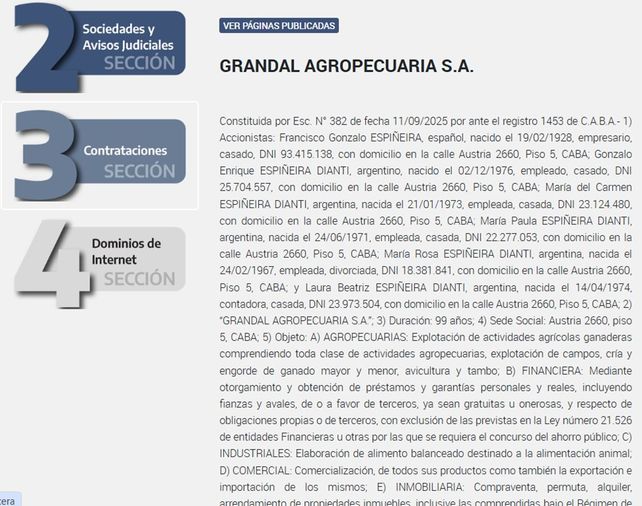 Según detalló la legisladora, se trata de Kawsay S.A., creada en Rosario el 2 de septiembre de 2025 y presidida por Mariel Espiñeira; Agro Prada S.A., constituida en la ciudad de Buenos Aires el 10 de septiembre de 2025, con Alejandro Espiñeira como presidente del directorio; y Grandal Agropecuaria S.A., registrada también en Ciudad de Buenos Aires el 11 de septiembre de 2025, con María del Carmen Espiñeira Dianti al frente.