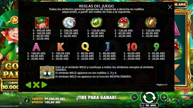 El duende es el símbolo más valioso del juego, seguido por figuras temáticas como el árbol dorado y otros elementos mágicos. El comodín aparece en los carretes centrales y ayuda a completar combinaciones ganadoras. Los símbolos de dinero son claves para activar la función de respins, donde se pueden obtener multiplicadores y premios acumulados, además de acceder a jackpots Mini, Minor, Major y Grand con pagos superiores.