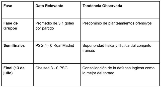 El torneo fue dominado finalmente por el Chelsea FC, que se coronó campeón tras vencer al Paris Saint-Germain en una final muy disputada. Sin embargo, el camino estuvo lleno de sorpresas tácticas: