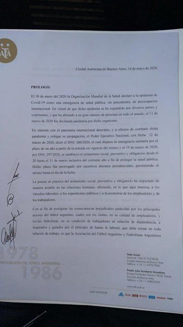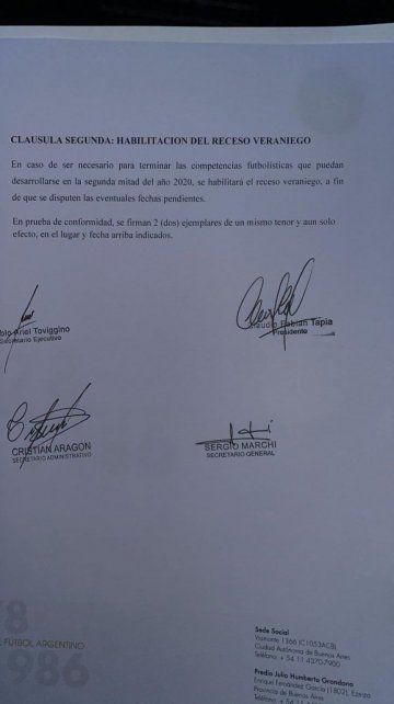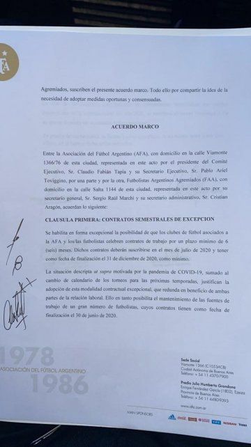 El acuerdo, que lleva la firma tanto de Claudio Tapia -presidente de AFA- como de Sergio Marchi -Secretario General de FAA- tiene como una de sus misiones principales "posibilitar el mantenimiento de las fuentes de trabajo de un gran número de futbolistas, cuyos contratos tienen como fecha de finalización el 30 de junio de 2020".
