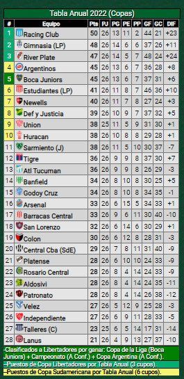 El certamen argentino es muy generoso en cuanto al reparto de cupos para las copas, ya que se clasifican a la Copa Libertadores los campeones de los campeones de los torneos de la LPF y el ganador de la Copa Argentina. En tanto que por tabla acumulada tres van al máximo certamen continental, y los otros siete al segundo torneo en importancia en el ámbito Conmebol.