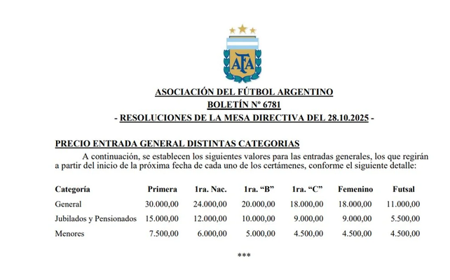 La Asociación del Fútbol Argentino (AFA) confirmó nuevos valores para las entradas del fútbol argentino con aplicación inmediata desde la próxima fecha en todas las categorías. Unión y Colón, atentos.