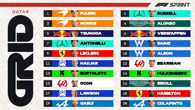 Finalmente, el australiano Oscar Piastri con su McLaren quedó en el primer puesto de la clasificación con un tiempo de 1:20.055, el británico George Russell con su Mercedes finalizó en el segundo puesto con 1:20.087 y Lando Norris, con McLaren, tercero con 1:20.285.