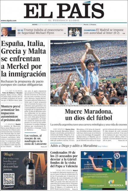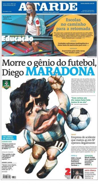 En España, en tanto, el diario deportivo As tituló "D10S ha muerto", sobre una foto de Maradona con los colores de la "albiceleste".