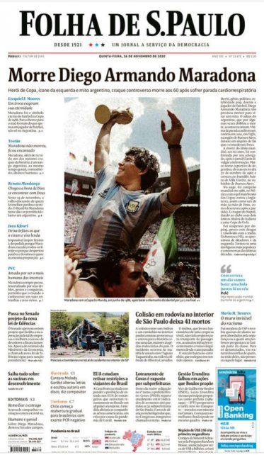 "Está en las manos de Dios", es el título de tapa en el que coincidieron varios diarios británicos, entre ellos el Daily Mirror, The Sun y Metro para recordar a Diego Maradona, cuya muerte y el impacto desatado quedó plasmado en la prensa de todo el mundo, que ilustran la congoja colectiva en la Argentina y la conmoción de sus admiradores e hinchas en el resto del planeta.