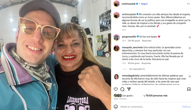 Martín Rechimuzzi, actor e influencer, expresó su dolor ante la perdida de su amiga: “Mi conexión con ella siempre fue desde el respeto, reconociéndola como un ícono queer. Nos diferenciábamos en algunas formas de ver la política, pero era innegable su amor por la vida, su deseo de inspirar a los demás y sus ganas de compartir risas. Gracias, Ale, por tu amistad”.