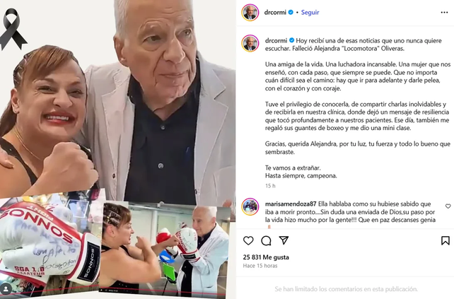 El Dr. Alberto Cormillot le dedicó una sentida carta abierta a la boxeadora, junto a una imagen de ambos abrazados: "Hoy recibí una de esas noticias que uno nunca quiere escuchar. Falleció Alejandra "Locomotora" Oliveras. Una amiga de la vida. Una luchadora incansable. Una mujer que nos enseñó, con cada paso, que siempre se puede. Que no importa cuán difícil sea el camino: hay que ir para adelante y darle pelea, con el corazón y con coraje".