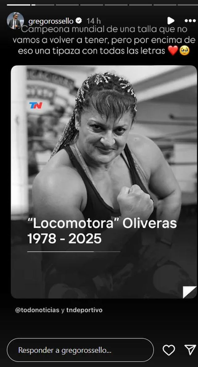 La lamentable noticia del fallecimiento de Alejandra "Locomotora" Oliveras a sus 47 años, séxtuple campeona internacional de boxeo, conmovió profundamente tanto al ámbito deportivo como al del espectáculo. Por ello, numerosos famosos manifestaron su dolor en redes sociales, despidiendo con emotivos mensajes a la legendaria deportista.