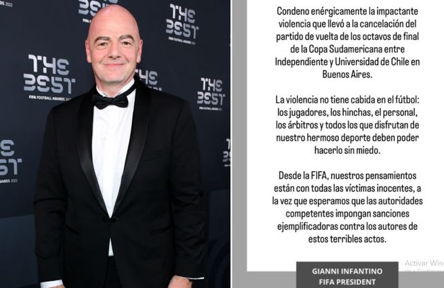 El presidente de la FIFA utilizó sus redes sociales para condenar "enérgicamente la impactante violencia que llevó a la cancelación del partido" entre Independiente y Universidad de Chile por Copa Sudamericana.