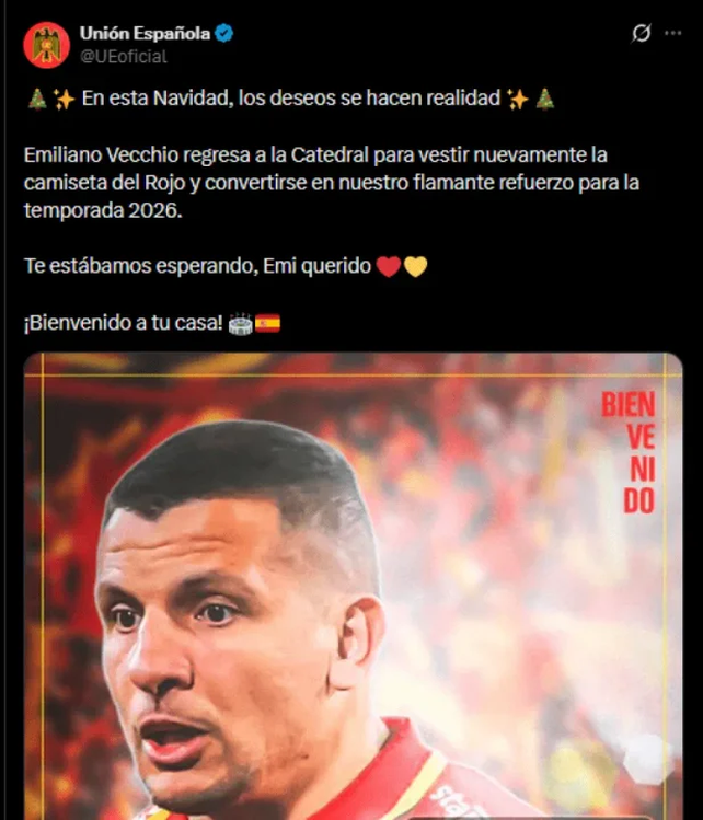 El anuncio oficial se realizó en un clima festivo, acorde a las fechas de fin de año, y apeló a la identidad del club y al sentimiento de pertenencia. “En esta Navidad, los deseos se hacen realidad. Emiliano Vecchio regresa a la Catedral para vestir nuevamente la camiseta del Rojo y convertirse en nuestro flamante refuerzo para la temporada 2026. Te estábamos esperando, Emi querido. ¡Bienvenido a tu casa!”, expresó Unión Española a través de sus redes sociales.