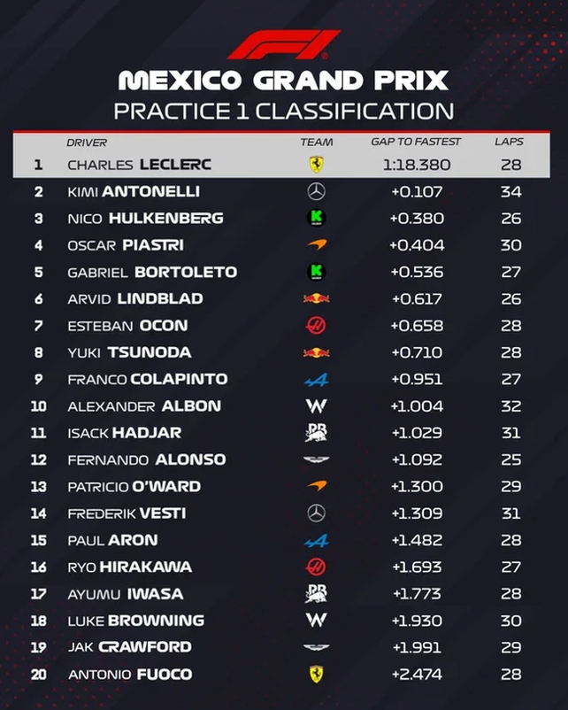Los primeros entrenamientos libres (FP1) de la Fórmula 1 en el autódromo Hermanos Rodríguez de México DF tuvieron una carga emotiva especial para el piloto argentino Franco Colapinto, quien finalizó 9° y se jugó un test “mano a mano” frente a Paul Aron, su principal rival para ocupar una butaca en Alpine en 2026.