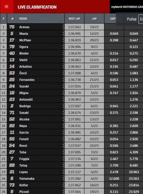 Rodrigo, de 23 años, tuvo una diferencia de +2.221 segundos respecto del ganador, que llegó escoltado por el español Jaume Masia (Honda) y el británico John McPhee (Honda).