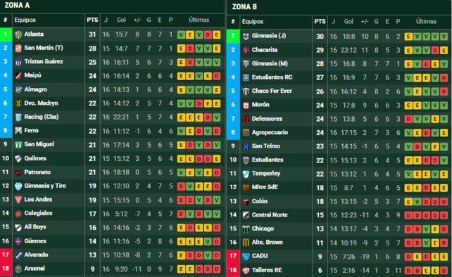 En tanto, en el Grupo A, el que manda es Atlanta, que le sacó tres puntos de ventaja a San Martín de Tucumán, consolidándose como líder en una zona muy peleada.