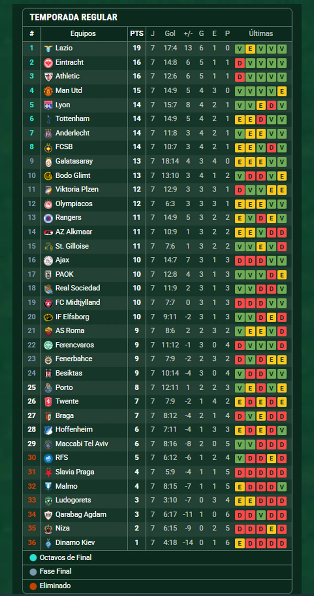 Otros resultados: Az Alkmaar 1 - Roma 0; Bodoe/Glimt 3 - Maccabi Tel Aviv 1; Porto 0 - Olympiacos 1; Fenerbahce 0 - Lyon 0; Maloe 2 - Twente 3; Hoffenheim 2 - Tottenham 3; Qarabag 2 - FCSB 3; Viktoria Plzen 2 - Anderlecht 0; Elfsborg 1 - Niza 0; Ludogorets 0 - Midtjylland 2; PAOK 2 - Slavia Praga 0; RFS 1 - Ajax 0 y Union St Gilloise 2 - Sporting Braga 1.