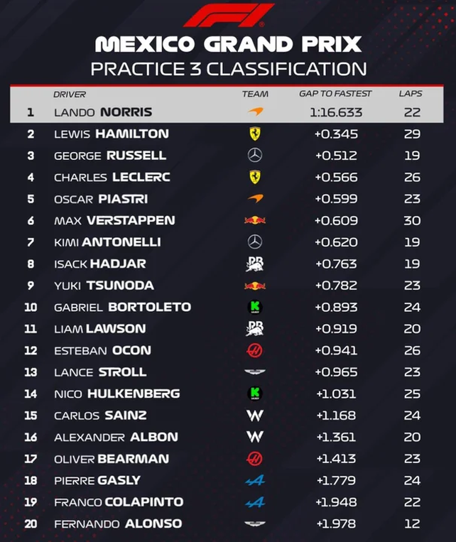 Con esta última práctica, los equipos y pilotos completan su preparación para la clasificación, que definirá el orden de salida para la carrera. Lando Norris llega con confianza, mientras que otros equipos deberán ajustar sus estrategias y encontrar velocidad para no perder terreno.