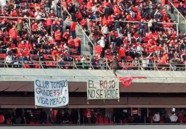 El presidente de Independiente, Néstor Grindetti, recibió un insulto escrito en una bandera de los fanáticos: "Club tomado. Grindetti viejo meado". No fue la única bandera con un agravio a la dirigencia de turno, ya que había otro telón pequeño que decia: “El Rojo no se vende“.