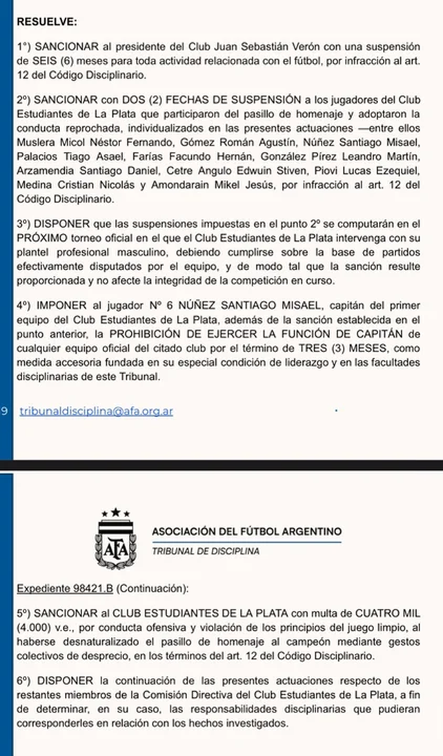 Además, Juan Sebastián Verón deberá afrontar una multa de 4.000 dólares por “conducta ofensiva y violación de los principios del juego limpio”. Por último, el Tribunal dispuso continuar las actuaciones sobre otros integrantes de la Comisión Directiva de Estudiantes, con el fin de determinar si corresponden nuevas sanciones por los hechos investigados.