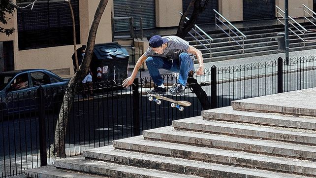 En 2023 tuvo dos hitos: primero realizó un salto impactante -front side flip- en las escaleras de la facultad de Ingeniería que ni los profesionales top internacionales que vinieron al país pudieron completar. Un NBD (Never Been Done), como dicen en un idioma, que generó un fotón que se viralizó en el ambiente.
