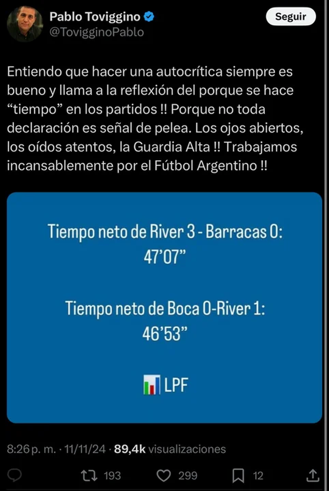 En el mismo posteo, Toviggino detalló que en el partido entre River y Barracas del último fin de semana se jugaron 47 minutos y 7 segundos de tiempo neto y lo comparó con el último Superclásico, que terminó en victoria del “Millonario”, en el que se disputaron 14 segundos menos.