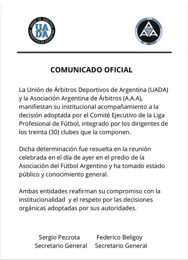 En el texto, los árbitros reafirmaron además su compromiso con la institucionalidad y con el respeto a las decisiones orgánicas adoptadas por las autoridades del fútbol argentino, en una clara señal de apoyo a la conducción encabezada por Claudio Tapia.
