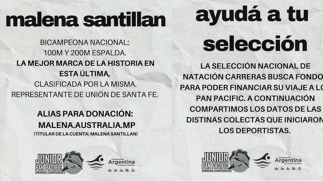 Ayuda para viajar a Canberra. La selección nacional de natación busca fondos para poder financiar su viaje a los Pan Pacific Junior Canberra 2024. La mejor marca de la historia en 200 metros espalda, clasificada por la misma, representante de Unión de Santa Fe, se la puede ayudar así: malena.australia.mp.