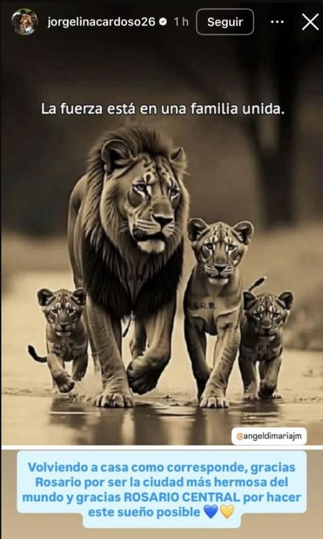 "Volviendo a casa como corresponde. Gracias Rosario por ser la ciudad más hermosa del mundo y gracias Rosario Central por hacer este sueño posible", escribió en una historia de Instagram con una foto de una manada de leones que representa a su familia, compuesta de su matrimonio con el delantero y sus dos hijas, Pia y Mia.
