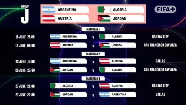 La Selección jugará contra Austria, Argelia y Jordania. Los partidos serán en Kansas City y Dallas, con horarios entre las 15:00 y las 23:00 horas de Argentina.