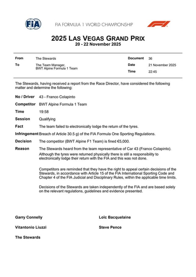 La FIA emitió el Documento 36 a las 03:45 de la madrugada (hora argentina), confirmando que el equipo Alpine fue multado con €5.000 (cinco mil euros) por la falta.