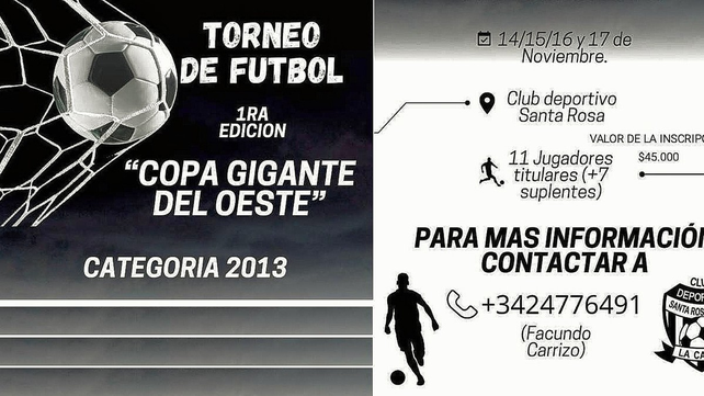 El Club Deportivo Santa Rosa, organiza la 1° edición de la Copa Gigante del Oeste, para la categoría 2013, desde el 14 al 17 de noviembre en La Casita