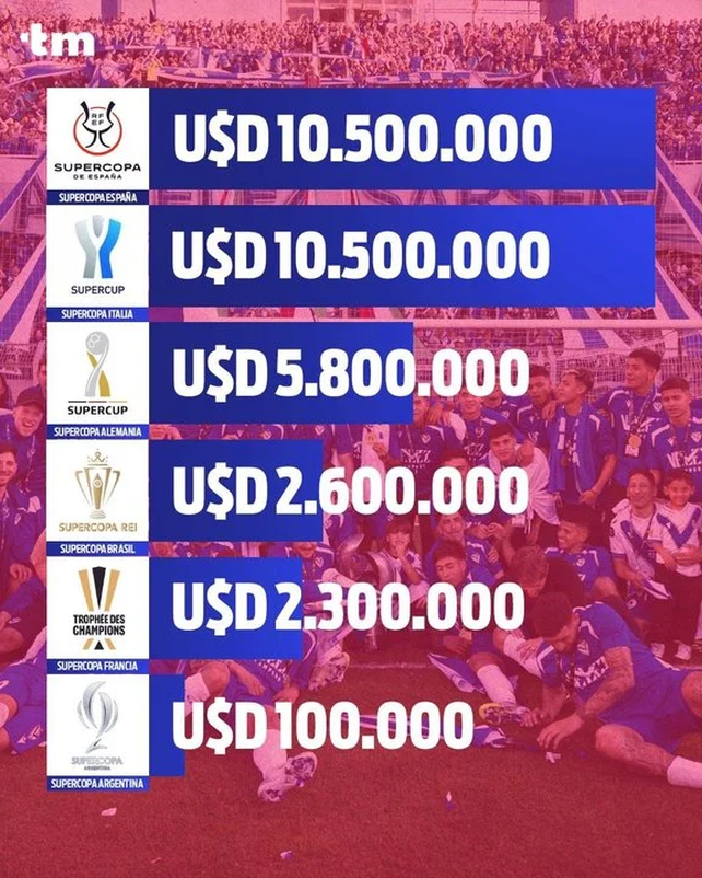 En Francia, la Supercopa entrega 2.3 millones de dólares mientras que en Brasil otorga 300 mil dólares más y 5.8 millones total en Alemania. Los que más entregan son España e Italia, que otorgan 10.5 millones de dólares.