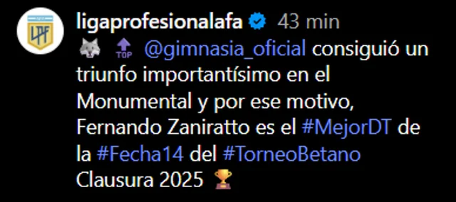 “Gimnasia de La Plata consiguió un triunfo importantísimo en el Monumental y por ese motivo, Fernando Zaniratto es el Mejor D.T de la Fecha 14 del Torneo Clausura 2025”, manifestó la cuenta oficial de la Liga Profesional de Fútbol en la descripción de su publicación de Instagram.