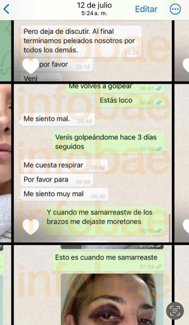 Las imágenes la muestran con un ojo y un brazo morados. También hay chats donde se dirige al expresidente para reprocharle haberla agredido físicamente