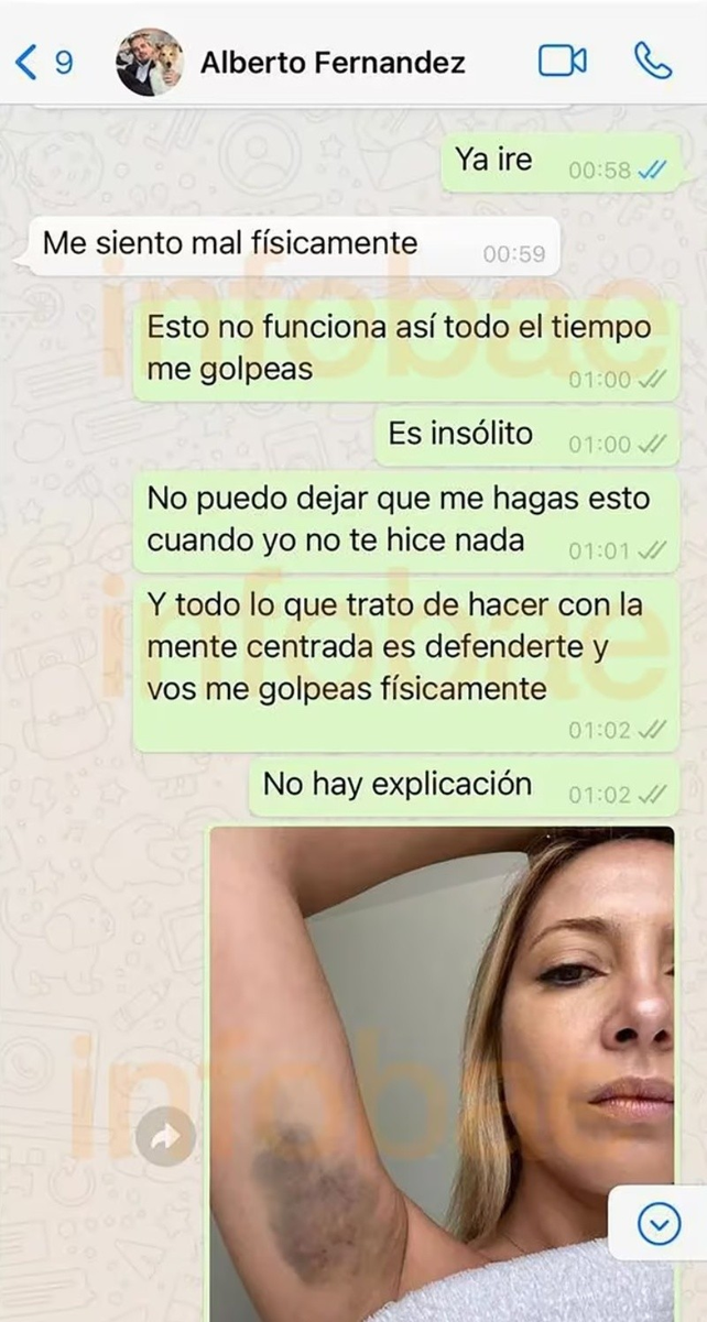 "Venís golpeándome hace 3 días seguidos", indican los chats de WhatsApp entre Yañez y Fernández, donde la ex primera dama muestra un moretón en el ojo y otro en el brazo, cerca de la axila. "Esto es cuando me samarreaste (sic)", escribe Yañez.