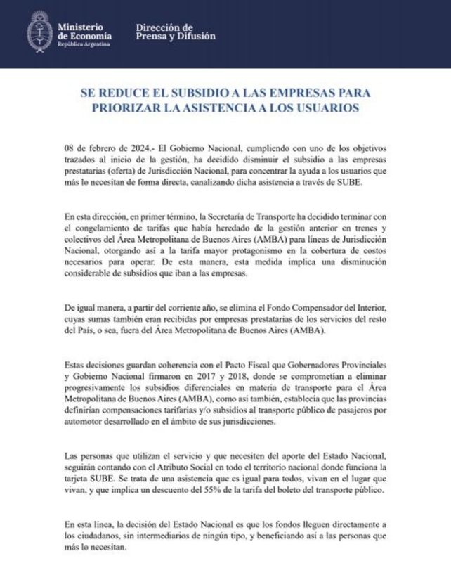 Además, se refirió a la decisión del gobierno de eliminar el Fondo Compensador del Interior, que subsidiaba los boletos de colectivos. El objetivo, señaló el texto oficial, es "concentrar la ayuda en los usuarios que más lo necesitan de forma directa, canalizando dicha asistencia a través de Sube".