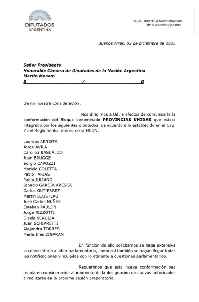 Finalmente, Provincias Unidas (PU) logró armar un bloque de 18 legisladores en la Cámara de Diputados nacional, que representa el espacio de gobernadores más grande. Santa Fe aporta cuatro legisladores y a la presidenta del bloque, la exvice de Santa Fe Gisela Scaglia. A ellos se suman cuatro votos más que conformarán un interbloque, que será el tercer espacio en la Cámara baja.