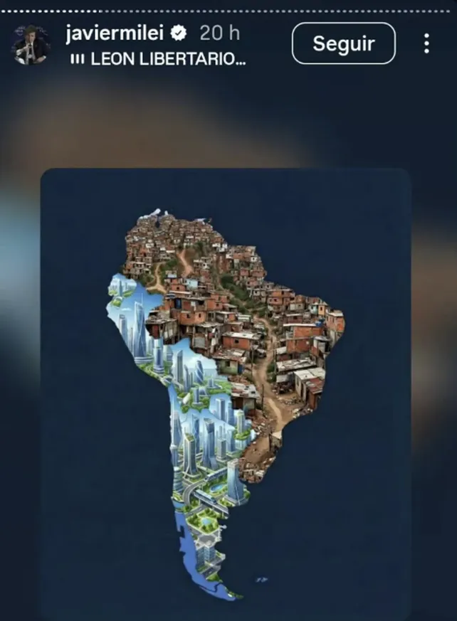No se trató, esta vez, de alguna disputa cara a cara entre ambos presidentes, separados por un océano ideológico y con un vínculo desde el inicio marcado por la frialdad, con picos de insultos y respuestas airadas. Un posteo en la red social Instagram con el mapa del continente americano, que describe a Brasil y otros países como Venezuela y Colombia como una inmensa favela (villa miseria), fue difundido por el presidente Milei y generó una durísima reacción de uno de los hombres más cercanos a Lula da Silva, el secretario general Guilherme Boulos.