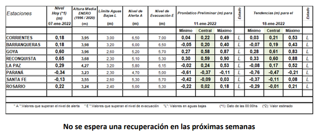 De acuerdo al INA, la región se encuentra aún bajo el fenómeno de La Niña, que genera condiciones de sequía. Asimismo, el organismo se delcaró en "alerta por bajante". En el informe se anuncia: "Prevalece una condición general de disminución de los caudales entrantes al tramo argentino del río Paraná. Los niveles fluviales continuarán en la franja de aguas bajas. La tendencia climática al 31 de marzo del 2022 es desfavorable".