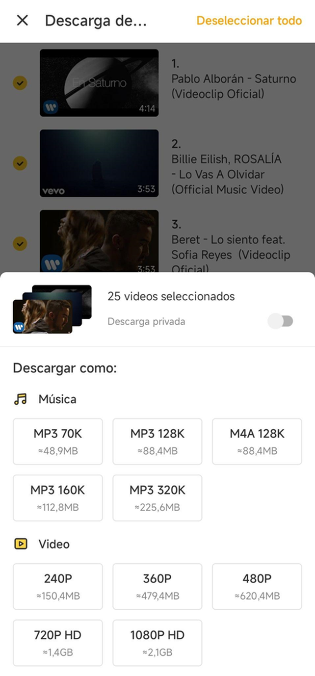 Para finalizar el proceso de descarga, solo debes presionar el botón de “Descargar” y seleccionar la calidad. En tiempo récord podrás disfrutar de tu archivo MP3 que estará alojado en la carpeta de descargas de tu dispositivo.