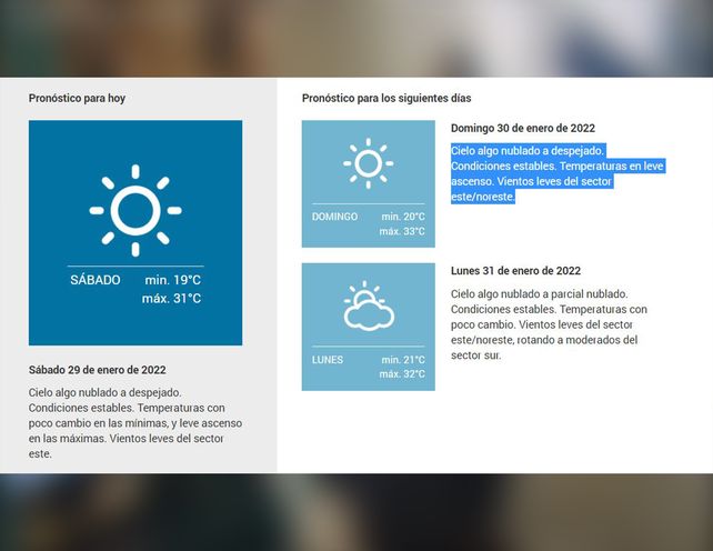 Para el domingo, pronostica "cielo algo nublado a despejado. Condiciones estables. Temperaturas en leve ascenso. Vientos leves del sector este/noreste". Una máxima de 20ºC y una máxima de 33ºC.