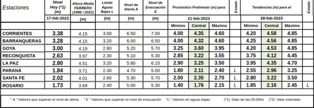 En la actualidad el último registro ubicó al Paraná en 2,04 metros frente al puerto local, aunque los pronósticos del Instituto Nacional del Agua destacan que para fines de febrero y principios de marzo el nivel del río se ubicaría en torno a los 3,20 metros, ascendiendo 120 centímetros en lo que comprende a febrero.