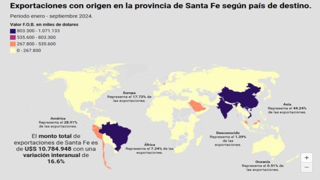 China es clave para las exportaciones, por ejemplo, de soja y carnes a otros mercados de la región y esto se refleja en Santa Fe, dado que se trata del segundo destino principal de las exportaciones con origen en la provincia por detrás de la India.