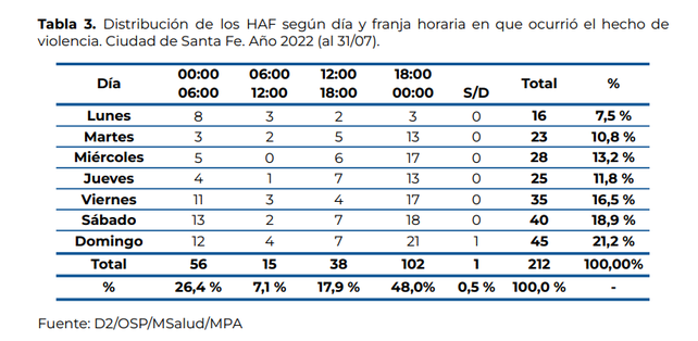 En el análisis que distingue las franjas horarias con mayor porcentaje de heridos de armas de fuego registrados y denunciados se destaca que poco menos de la mitad han sucedido entre las 18 horas y la medianoche. Si se suma la franja horaria inmediatamente posterior a la mencionada, que va desde las 00 hasta las 6, se observa que tres de cada cuatro heridos de armas de fuego resultaron lesionadas durante la noche o la madrugada.